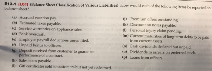 The portion of bonds or notes payable that is due within one year is reported as a n current liability on the balance sheet. Balance sheet classification of various liabilities how would each of the following items be reported on the balance sheet. Vacation pay payable is reported on the balance sheet as a.